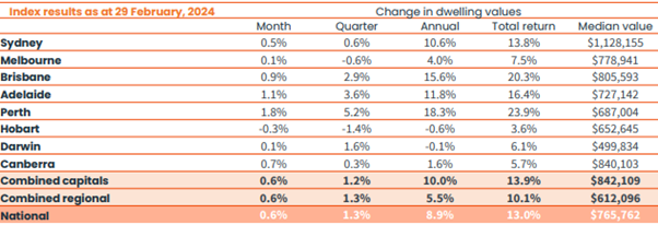 - Perth continues to lead capital growth performance in the greater capital city markets, with values up 5.2% in the three months to February and up 18.3% over the past year.